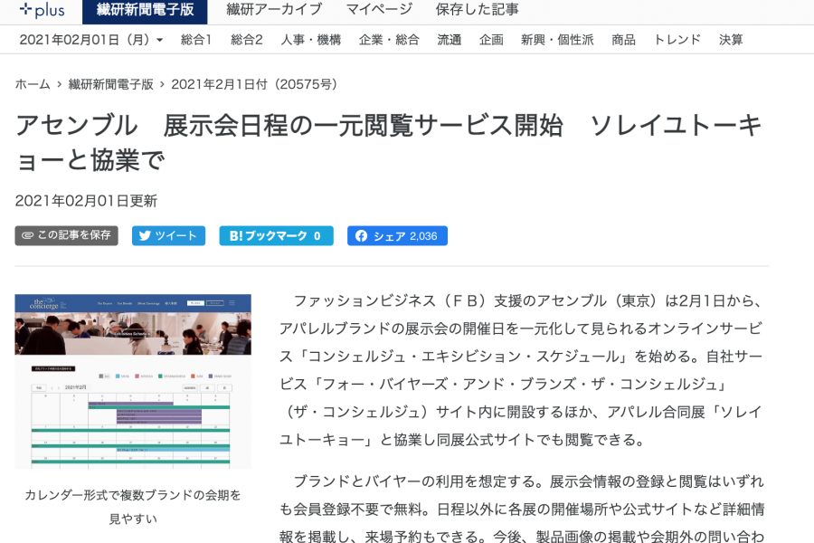 ファッションビジネス(FB)支援のアセンブル(東京)は2月1日から、アパレルブランドの展示会の開催日を一元化して見られるオンラインサービス「コンシェルジュ・エキシビション・スケジュール」を始める。自社サービス「フォー・バイヤーズ・アンド・ブランズ・ザ・コンシェルジュ」(ザ・コンシェルジュ)サイト内に開設するほか、アパレル合同展「ソレイユトーキョー」と協業し同展公式サイトでも閲覧できる。