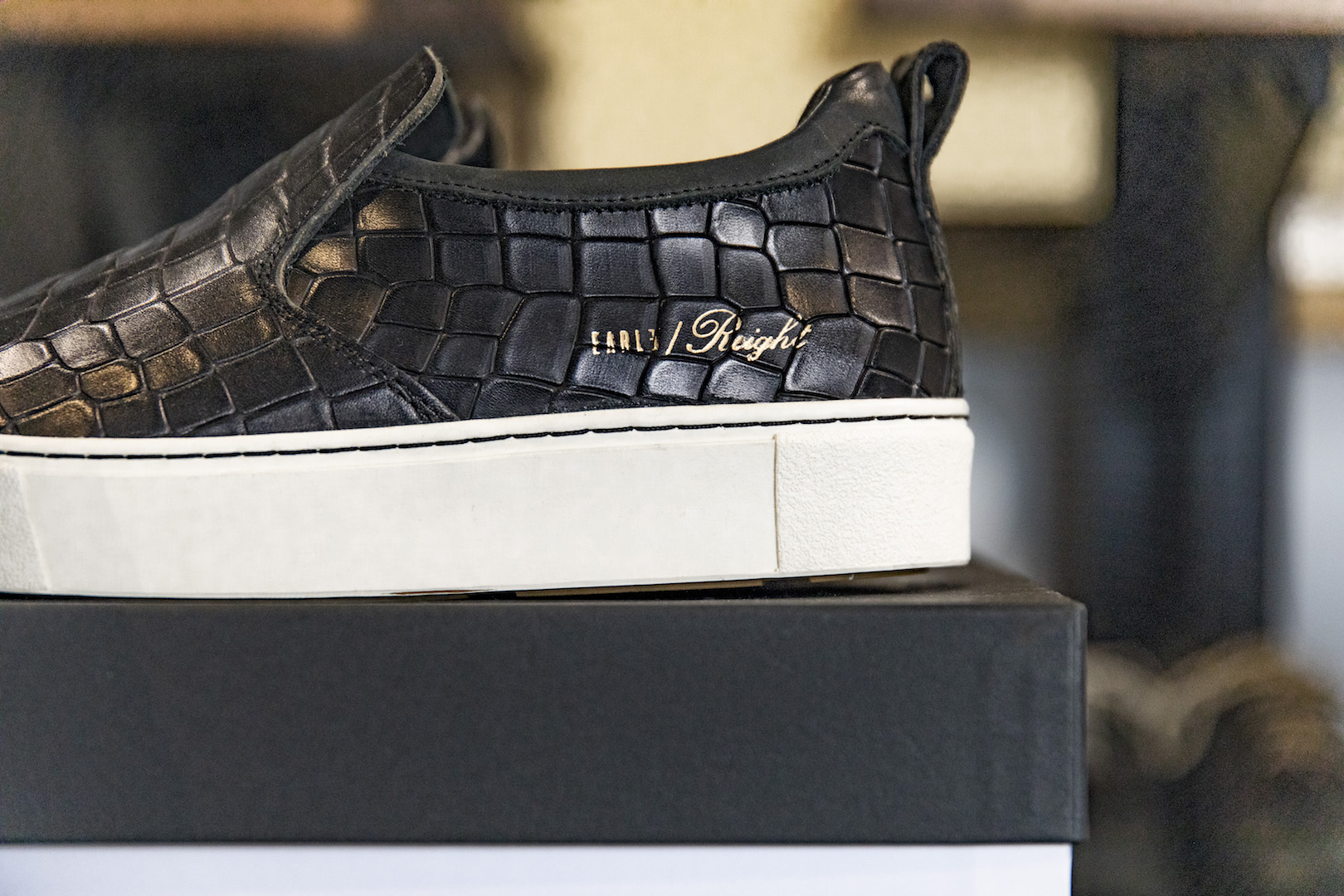 (レディスシューズでよく使われる本革クロコレザー型押しを独自の視点でメンズライクに落とし込み、エレガントさを追求したスニーカー)